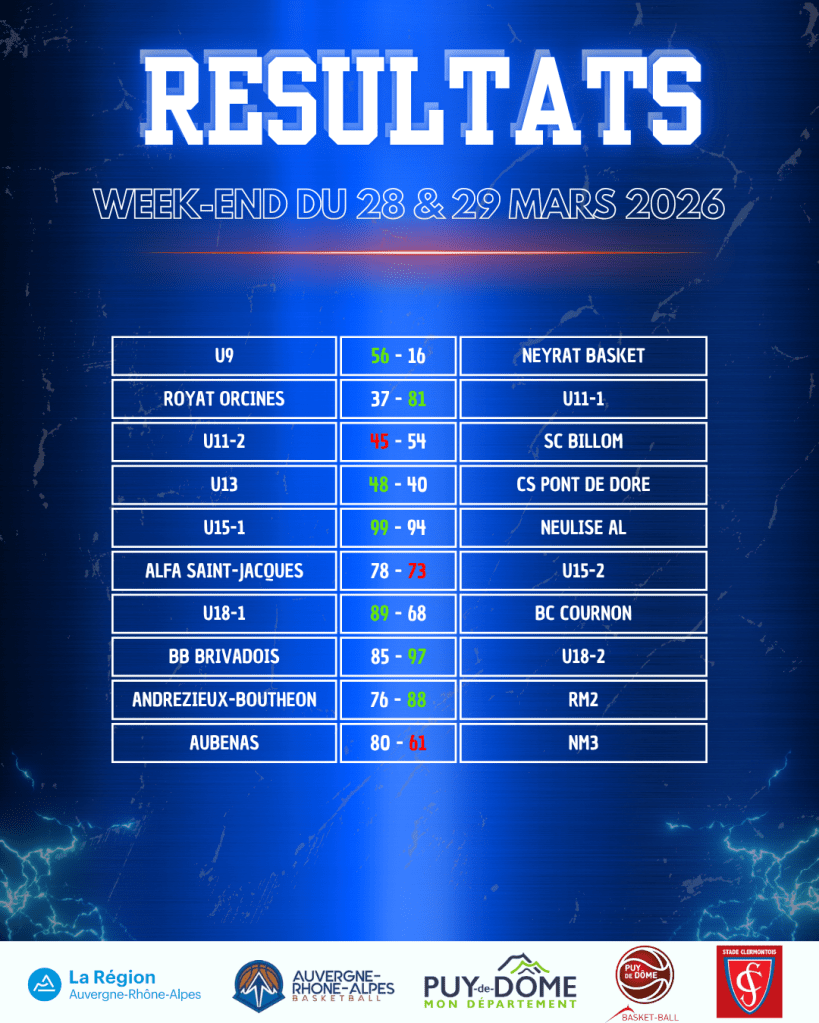 Belle réaction également des U18-1, qui s’imposent avec autorité face à Cournon 89-68, prouvant que constance et régularité finissent toujours par payer. De leur côté, les U18-2 se sont imposés 85-97 face à Brioude, offrant une prestation convaincante.